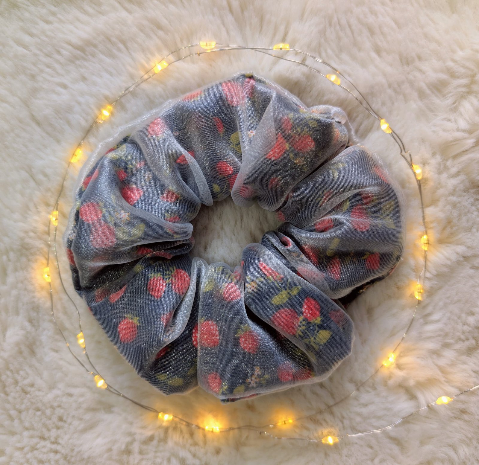 A black cotton scrunchie sprinkled with cute strawberry prints and covered in a light layer of sheer organza. Soft on your hair and perfect for adding a fun little pop to your outfit.