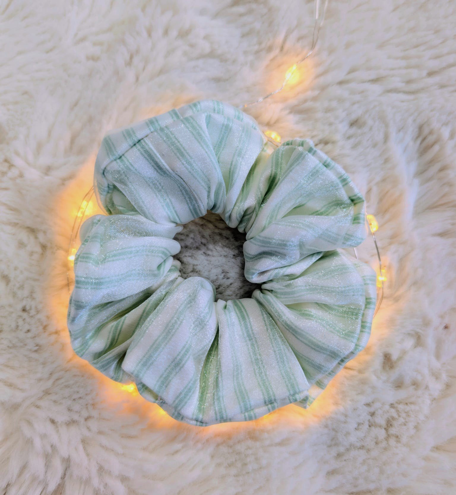 This cotton scrunchie features soft pastel green stripes, finished with a delicate layer of sheer organza. It’s gentle on your hair while giving your hairstyle a subtle, playful glow.