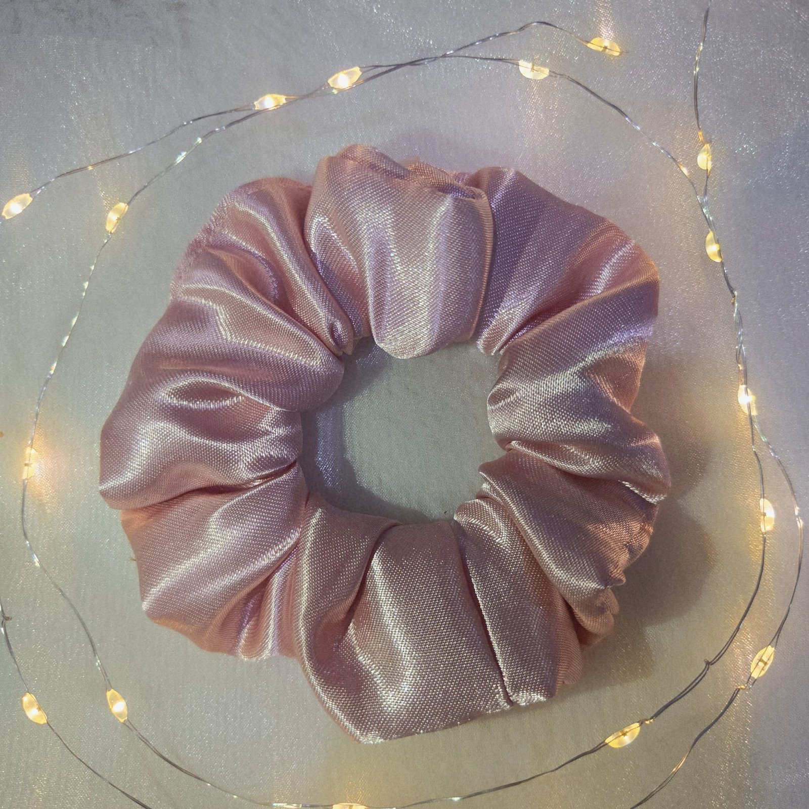 A dusky pink satin scrunchie in a muted blush tone, soft on hair with a lightweight, glossy feel.