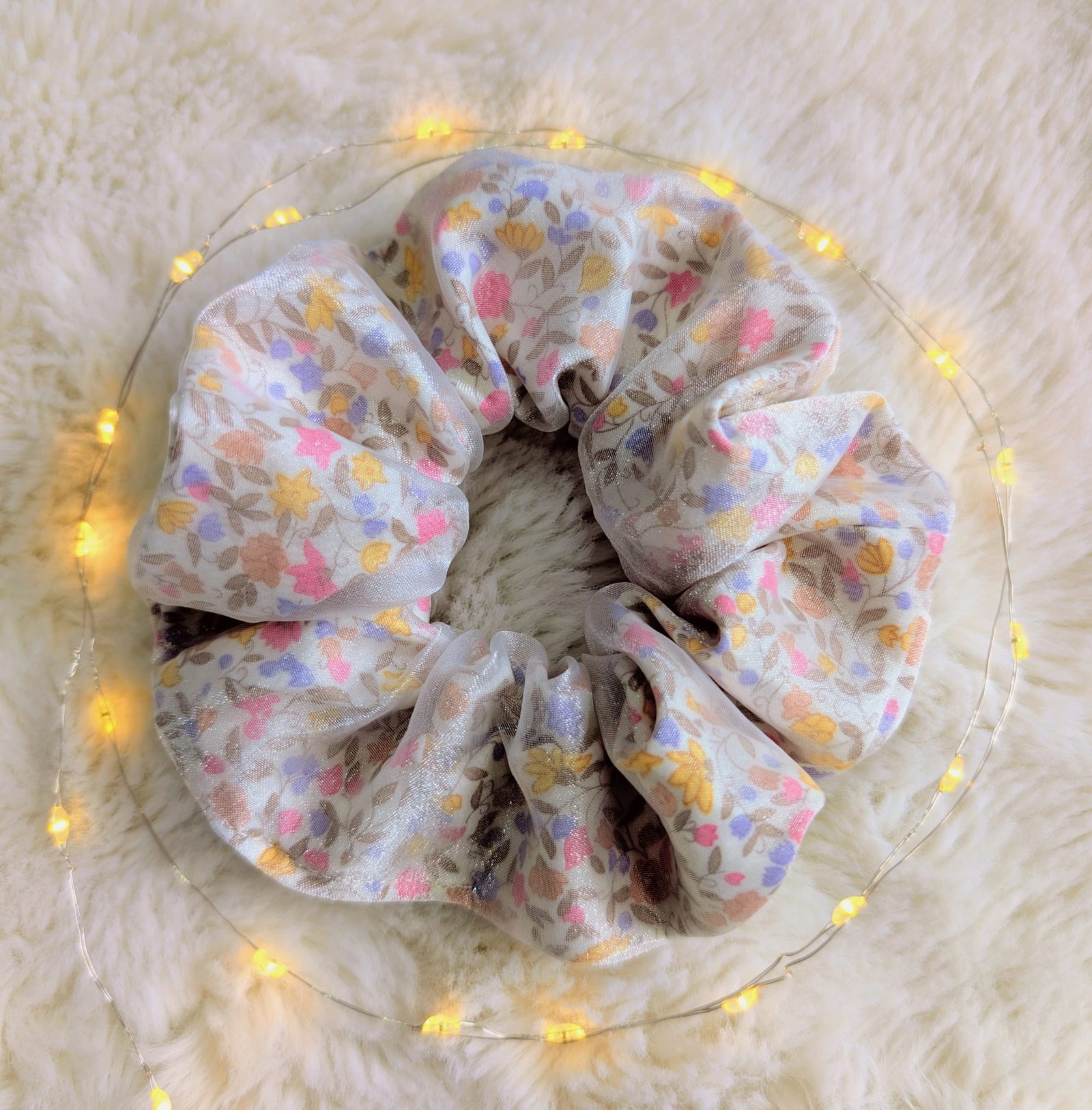 This cotton scrunchie features a cheerful floral print on a white background, finished with a delicate organza overlay. Soft, lightweight, and perfect for bringing a cute spring feel to your hairstyle.