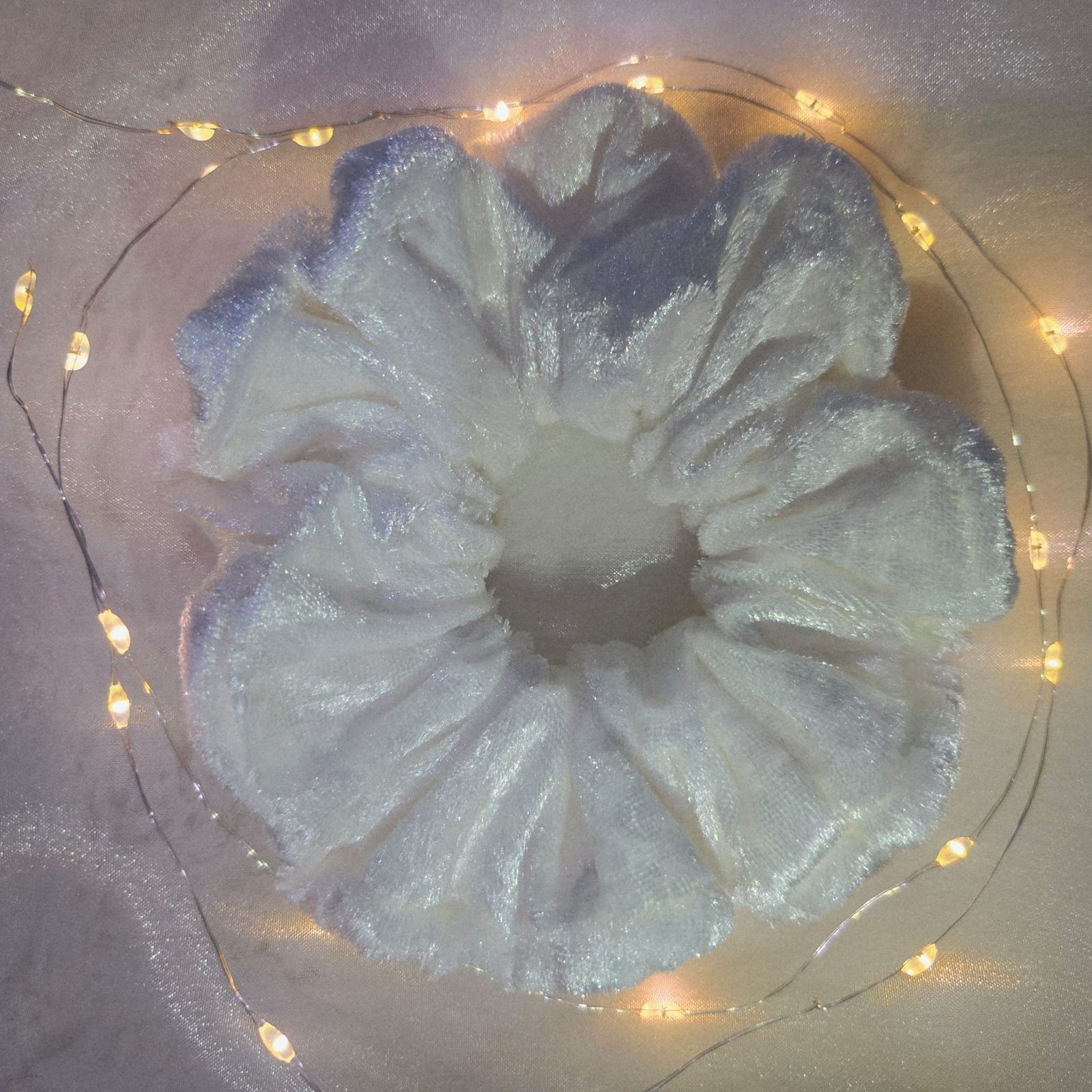 Crafted from a luxurious white velvet, this scrunchie offers a soft hold while adding a touch of simple elegance. Its cloud-like texture and light ivory tone make it a versatile accessory. Adds depth, shine, and a bold statement to any hairstyle.
